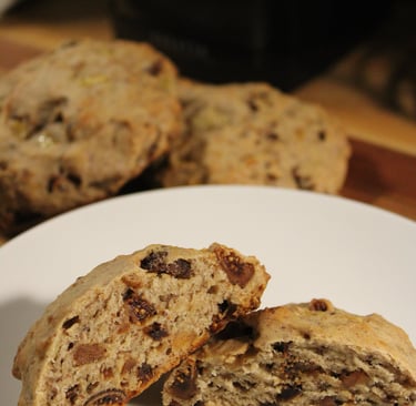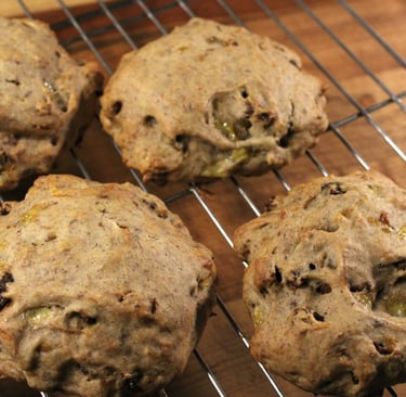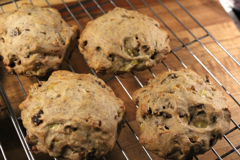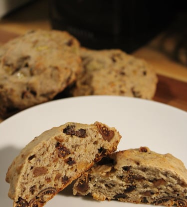 Mix the dry ingredients into the wet until the dough is formed; it should be thick but sticky. Fold in the dates.