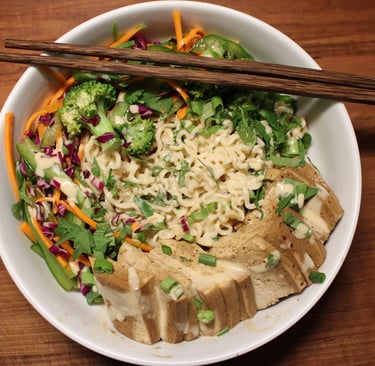 Allow all ingredients to completely cool. Once cool, evenly distribute the ramen between two bowls, dress with slaw and tofu, garnish with cilantro and sesame seeds and sriracha or chili oil if desired. Serve and enjoy!