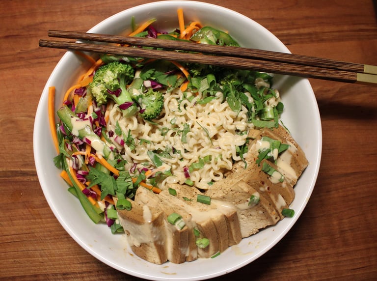 Cook the ramen in boiling water (without any seasoning packet) until cooked thoroughly. Toss in the tahini dressing and refrigerate.