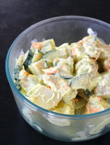 After the potatoes are cooked, strain and rinse with cool water. Allow the potatoes to cool for another 15 minutes. Mix the potatoes into the dressing, top with grated carrot, and cool again for at least 45 minutes.