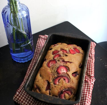 Pour the batter into the loaf pan. Add the remaining strawberries on top of the batter in a line or pattern.